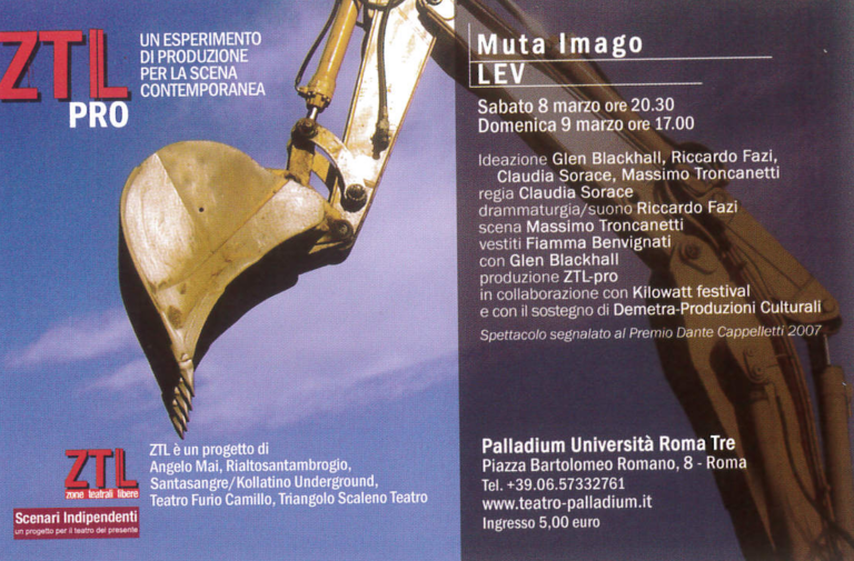 Ideazione: Glen Blackhall, Riccardo Fazi, Claudia Sorace, Massimo Troncanetti Regia: Claudia Sorace Drammaturgia: Riccardo Fazi Produzione: ZTL-pro...